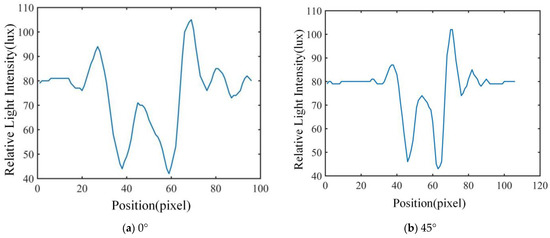 The characteristics of the diffraction–polarization fingerprint of airborne disease spores are closely related to the species, size, geometry and light absorption of spores. According to the extraction process of the airborne disease spore diffraction–polarization fingerprint image, the relative light-intensity distribution of the airborne disease spore diffraction–polarization fingerprint was obtained, as shown in Figure 6.
