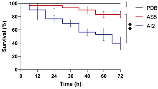 Figure 1. Survival rate of C. elegans reared in the presence of the secretome of B. bassiana. The fungal strains AI2 and AS5 were grown on PDB culture medium, and the cell-free media were used to perform the assays. A total of 15 nematodes were used per experiment and incubated at 18 °C for 72 h. n = 3, with three independent repetitions. Data were statistically analyzed using the Mantel–Cox test; **, p < 0.01.