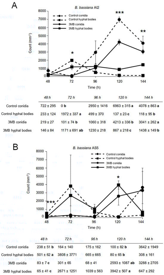 Figure 2. Development of B. bassiana AI2 (A) and AS5 (B) strains inoculated on MacConkey agar medium and exposed to 3-methylbutanol (3MB). The inoculum size was 106 spores. The experiment was conducted in triplicate. Data are presented as mean ± standard error. Asterisks indicate means that differed significantly at * p ˂ 0.05, ** p ˂ 0.01, *** p ˂ 0.001 based on one-way ANOVA and Fisher’s LSD test. Means within columns with different letter indicate statistically significant differences using one-way ANOVA and Tukey’s test (p ≤ 0.05).