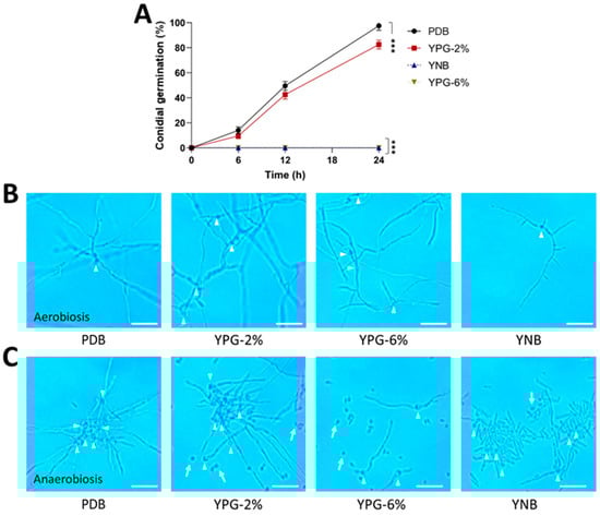 Figure 3. Effect of the carbon and nitrogen sources and oxygen on the morphology of the strain AS5 of B. bassiana at 24 h of fungal growth. Conidia were germinated in PDB, YPG-2%, YPG-6% and YNB for 24 h at 28 °C (anaerobiosis) and 150 rpm (aerobiosis). (A) Germination kinetics under aerobiosis conditions. Representative photographs at 100× of the morphology in (B) aerobiosis and (C) anaerobiosis at 24 h. White arrowheads indicate germinated conidia and white arrows indicate ungerminated conidia. Scale bar, 20 μm. n = 3, with three independent repetitions. Data were analyzed with one-way ANOVA and Fisher post hoc test (***, p < 0.001).