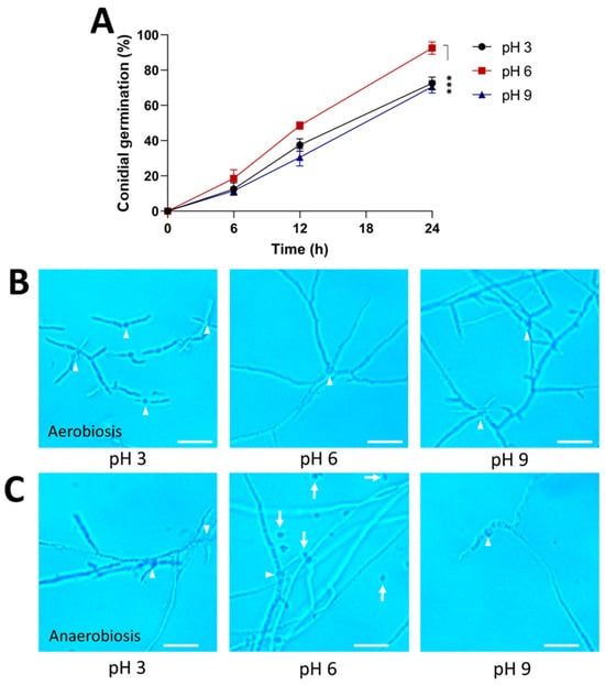 Figure 4. Effect of pH on the morphology of the strain AS5 from B. bassiana. Conidia were germinated in PDB at pH 3, 6, and 9 for 24 h at 28 °C (anaerobiosis) and 150 rpm (aerobiosis). (A) Germination kinetics under aerobiosis conditions. Representative photographs at 100× of the morphology during (B) aerobiosis and (C) anaerobiosis at 24 h. White arrowheads indicate germinated conidia and white arrows indicate ungerminated conidia. Scale bar, 20 μm. Data were analyzed with one-way ANOVA and Fisher post hoc test (***, p < 0.001).