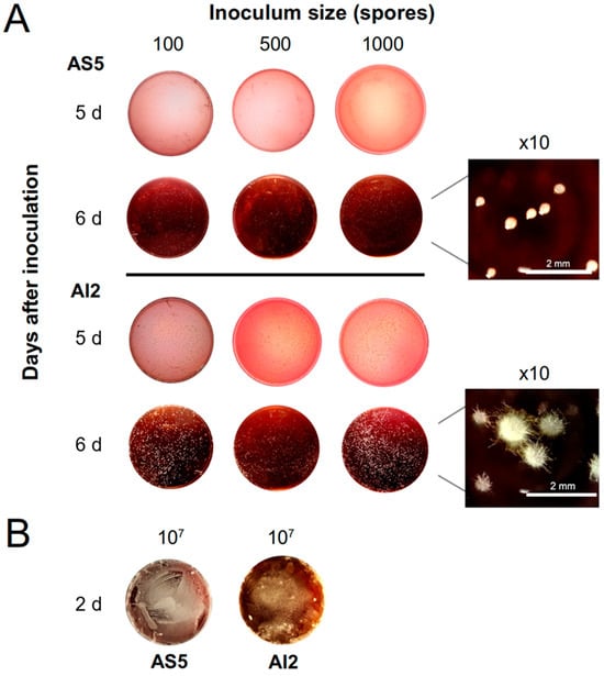 Inoculum sizes of 100, 500, and 1000 spores allowed for yeast-like development in AS5 at 6 d post-inoculation, whereas mycelial development was observed in AI2 (Figure 5A). The highest inoculum size of 107 spores promoted dimorphic transition in both strains, and mycelial development was evident after 2 d of fungal growth (Figure 5B).