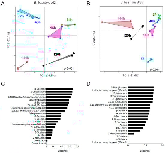 Figure 6. Principal component analysis (PCA) plots obtained based on the data of volatiles emitted by AI2 (A) and AS5 (B) strains on MacConkey agar medium and analyzed via GC-MS at different times of the fungal growth (n = 3). PERMANOVA (α = 0.05). (C,D) Plots depicting the contribution of the compounds to PCA using the relative peak areas (%) obtained in the chromatograms from AI2 and AS5, respectively.