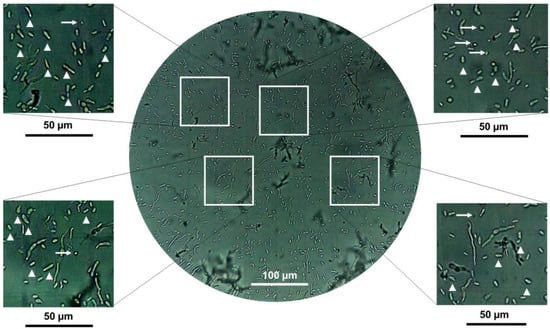 Figure 7. Representative microscopic image recorded at 40× for hyphal bodies, conidia, and mycelium of B. bassiana AS5 at 72 h of fungal growth and during exposure to 3-methylbutanol. An inoculum size of 106 spores was inoculated on MacConkey agar culture medium. White arrowheads indicate yeast-like cells and white arrows indicate conidia.