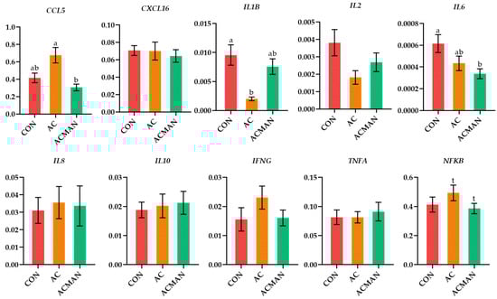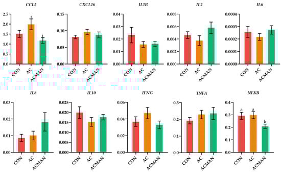 The relative transcript levels of selected genes in Chios ewes’ monocytes of the three dietary treatment groups (CON, AC, and ACMAN). Means with different superscript letters (a, b) differ significantly at p < 0.05. Error bars represent the SEM. CCL5, C-X-C motif chemokine 5; CXCL16, C-X-C motif chemokine ligand 16; INFG, interferon γ; IL1B, interleukin-1 beta; IL2, interleukin-2; IL6, interleukin-6; IL8, interleukin-8; IL10, interleukin-10; TNFA, tumor necrosis factor A; NFKB, nuclear factor kappa B.