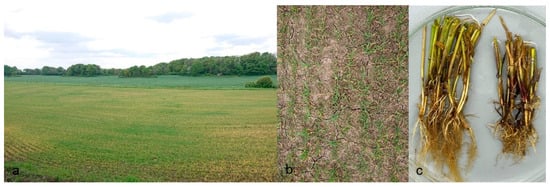 (a,b) Barley field with infection of Aphanomyces macrosporus causing yellow patches. (c) Moderately and severely infected field plants with brown coleoptiles and discoloured roots.