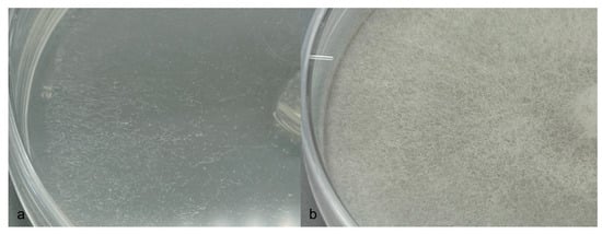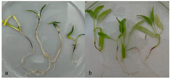 In artificial pathogenicity experiments using the inoculum layer method, disease symptoms like those observed in the field were developed in barley, spinach, and sugar beet (Figure 3a–c and Figure 4a,b). No symptoms at all were found in peas or faba beans (data to be published). In the case of spinach and sugar beet, the symptoms resembled those caused by A. cladogamus and A. cochlioides infection, i.e., seedling damping off, as well as plants with brownish hypocotyls and roots [11]. Isolations of root segments on selective agar media and observations of growing colonies of Aphanomyces verified the pathogenicity and fulfilled Koch’s postulates. A similar pathogenicity assay with radish plants resulted in no symptoms at all on the plants, indicating that the barley Aphanomyces isolates do not belong to A. raphani (Figure 5).