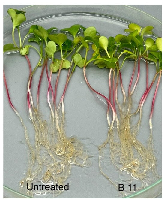 The pathogenicity tests of three isolates, B8, B9, and B11, were performed on barley cv. Planet under greenhouse conditions in order to examine their ability to cause disease symptoms similar to those observed in the field. In addition, other plants, such as spinach cv. Kiowa, sugar beet cv. Cartoon, peas cv. Linnea, and faba beans cv. Alexia, were included in the pathogenicity tests to repeat and to verify our findings from the earlier studies [11,12]. Radish (Raphanus sativus), cv. Cherry Belle, was also included in the pathogenicity assay to compare the pathogenic properties of the isolates to those of A. raphani J.B. Kendr., capable of infecting Raphanus spp. [13]. Briefly, the strains were cultivated on CMA for 10 days; then, the agar plates with the cultures were placed as an inoculum layer in pots filled with vermiculite. Before sowing, the seeds were surface-sterilised in a sodium hypochlorite solution consisting of 1 part common laundry bleach (2.7% sodium hypochlorite) to 2 parts clear water for 2 min and were then thoroughly rinsed in water. Seeds were placed one centimetre above the inoculum layer. The pots were placed in a greenhouse with similar conditions to those described above. Four weeks after sowing, the roots were washed in water and the symptoms were checked. Small root pieces with discoloured roots were placed on selective agar medium (SMA) for re-isolation of Aphanomyces sp. The plates were checked daily for outgrowing colonies.