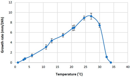 No isolates grew at 1 °C or 34 °C. From 3 °C to 25 °C, the increase in growth rate was almost linear (Figure 6), and the optimal growth temperature was 27 °C, followed by a rapid decline at higher temperatures.