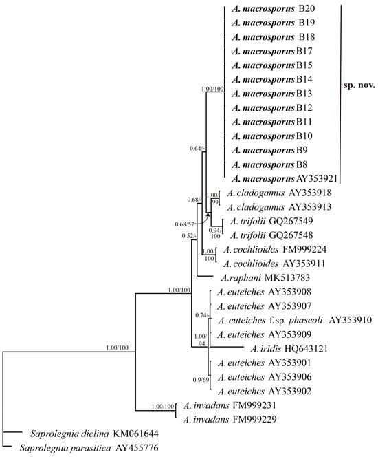 The identification of Aphanomyces isolates has been greatly facilitated using ITS sequencing data, which has overcome the difficulties and challenges of using morphologies, which are often limited by insufficient characters and large overlapping variations of the asexual and sexual structures. In this context, several studies have shown that ITS-based phylogenetic analysis can be reliably used for the identification and differentiation of species, elucidation of genetic relationships, and discovery of new members of the Aphanomyces genus [12,15,20,21]. The ITS sequence data of the single isolate of Aphanomyces (accession AY353921), originated from the roots of P. vulgaris, revealed that it was a distinct species which did not cluster with other plant pathogenic Aphanomyces species in the phylogenetic tree [12,15]. The ITSs of barley isolates were all identical to AY353921, which formed a well-supported and distinct cluster in this study.