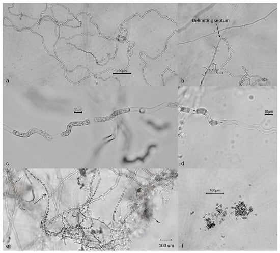 Sporangia of Aphanomyces macrosporus: (a) long sinuous sporangia; (b) delimiting septum between the hyphae and sporangium; (c–e) sporangia with elongated and moving zoospores immediately preceding discharge; (f) primary zoospores encysting at sporangium orifice on emergence.