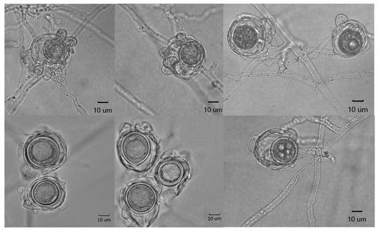 Aphanomyces macrosporus M. Wikström, L. Persson, & J. Fatehi, sp. nov. (Figure 6, Figure 7, Figure 8, Figure 9 and Figure 10), MycoBank number: MB849876. Holotype: Sweden, province of Scania, Kärrarp, isolated from naturally infected roots of Hordeum vulgare in field, 16 April 2021. Collector: M. Wikström. K-M1436392 (dried culture). Ex-type: Isolate B9 (Agro Plantarum Culture Collection). Gene Sequence ex-type: OQ972002 (ITS). Etymology: “macrosporus” refers to the large oogonia and oospores.