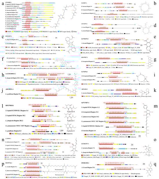 - Sayari, M.; Steenkamp, E.T.; van der Nest, M.A.; Wingfield, B.D. Diversity and evolution of polyketide biosynthesis gene clusters in the Ceratocystidaceae. Fungal Biol. 2018, 122, 856–866. [Google Scholar] [CrossRef]