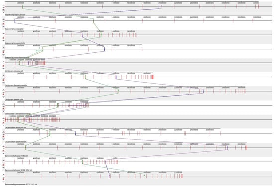 - Lowe, T.M.; Eddy, S.R. tRNAscan-SE: A program for improved detection of transfer RNA genes in genomic sequence. Nucleic Acids Res. 1997, 25, 955–964. [Google Scholar] [CrossRef] [PubMed]