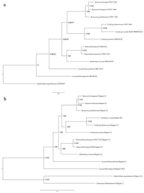 - Wang, Y.B.; Wang, Y.; Fan, Q.; Duan, D.E.; Zhang, G.D.; Dai, R.Q.; Dai, Y.D.; Zeng, W.B.; Chen, Z.H.; Li, D.D.; et al. Multigene phylogeny of the family Cordycipitaceae (hypocreales): New taxa and the new systematic position of the Chinese cordycipitoid fungus Paecilomyces hepialid. Fungal Divers. 2020, 103, 1–46. [Google Scholar] [CrossRef]