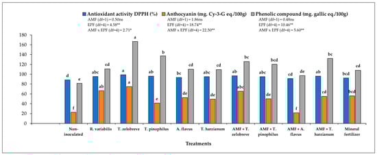 Concentration of anthocyanin and total phenolic compounds and antioxidant capacity of Maled Phai seeds. Different letters indicate significant difference at p ≤ 0.05 by LSD. Two-way ANOVA on plant data to test for synergistic effects between AMF and EPF. *, ** and ns: significant at p < 0.05, p < 0.01 and non-significant probability levels, respectively.