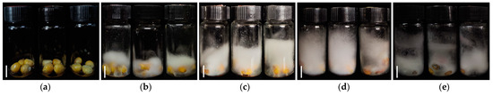 Figure 1. Typical phenotypic performance of kernels during the F. graminearum inoculation via the kernel bioassay in the laboratory. (a) Inoculated kernels at 0-day post-inoculation (dpi). (b) Inoculated kernels at 7 dpi. (c) Inoculated kernels at 14 dpi. (d) Inoculated kernels at 21 dpi. (e) Inoculated kernels at 28 dpi. Scale bar = 1 cm.