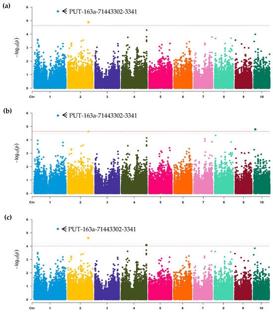 Figure 2. Manhattan plot of genome-wide association analysis (GWAS) for GER resistance with three models. (a) GWAS analysis using a fixed and random model circulating probability unification model (FarmCPU). (b) GWAS analysis using a general linear model (GLM). (c) GWAS analysis using a mixed linear model (MLM). The Y-axis value corresponds to -log10 (p) of p-value scores, and the X-axis indicates chromosomes and physical positions of SNPs. The red dashed lines show genome-wide significance at the adjusted thresholds of 2.04 × 10−5 for FarmCPU and GLM and 1.0 × 10−4 for MLM, respectively. The most significant association SNP PUT-163a-71443302-3341 was marked and co-localized by the combined FarmCPU, GLM, and MLM models.