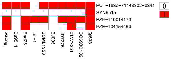 Figure 3. Distributions of favorable alleles among the ten elite lines. Red and white represent favorable and inferior alleles, respectively.