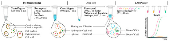 - Wang, Y.; Zhao, X.; Zhou, Y.; Lu, J.; Yu, H.; Li, S. Establishment and Application of Loop-Mediated Isothermal Amplification Coupled with Nanoparticle-Based Lateral Flow Biosensor (LAMP-LFB) for Visual and Rapid Diagnosis of Candida Albicans in Clinical Samples. Front. Bioeng. Biotechnol. 2022, 10, 1025083. [Google Scholar] [CrossRef]