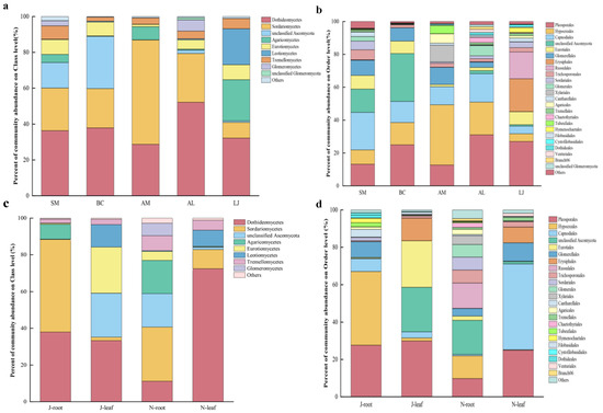 Relative abundance of the endophytic fungi at class and order levels in medicinal plants. (a) Endophytic fungi of plants at the class level. (b) Endophytic fungi of plants at the order level. (c) Endophytic fungi of root and leaf at the class level. (d) Endophytic fungi of root and leaf at the order level. Note: the fungal class and order represent < 0.01% of the total reads of endophytic fungi, which were all assigned to “Others”. Abbreviations—SM: Salvia miltiorrhiza; BC: Bupleurum chinense; AM: Astragalus membranaceus; AL: Atractylodes lancea; LJ: Lonicera japonica. J: June; and N: November.