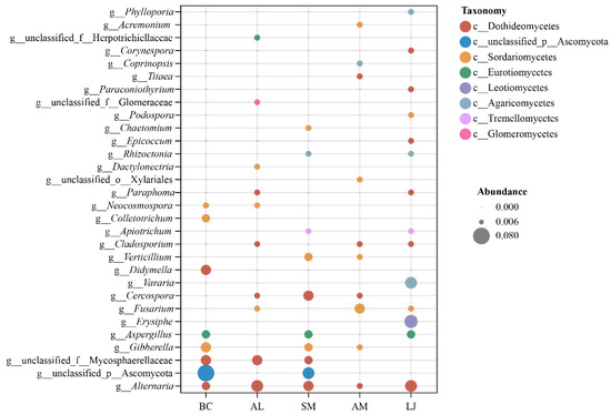 The bubble chart shows the top 30 genera of endophytic fungi in five medicinal plants (Figure 2). Unclassified Ascomycota was mainly distributed in S. miltiorrhiza and B. chinense, whereas Leotiomycetes was mainly distributed in L. japonica. Agaricomycetes was mainly distributed in L. japonica. In addition, Erysiphe, Vararia, and Alternaria were highly abundant in L. japonica. Fusarium mainly occurred in A. membranaceus, whereas Alternaria and unclassified Mycosphaerellaceae were present mainly in A. lancea. Unclassified Ascomycota, Cercospora, and Alternaria were highly abundant in S. miltiorrhiza. Finally, unclassified Ascomycota was higher in B. chinense.