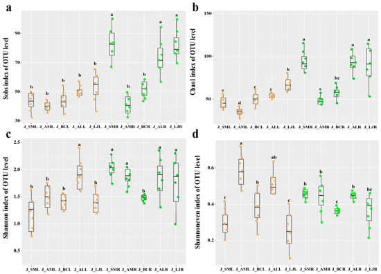 Operational taxonomic unit (OTU) richness and alpha diversity estimates of the fungal communities in June. (a) Sobs index at the OTU level. (b) Chao index at the OTU level. (c) Shannon index at the OTU level. (d) Shannon even index at the OTU level. Note: Different letters above the error bars indicate significant differences at p < 0.05. The orange dots represent the OTU of the leaf and the green dots represent the OTU of the root. Abbreviations—SM: Salvia miltiorrhiza; BC: Bupleurum chinense; AM: Astragalus membranaceus; AL: Atractylodes lancea; LJ: Lonicera japonica. R: Root; L: Leaf; J: June.
