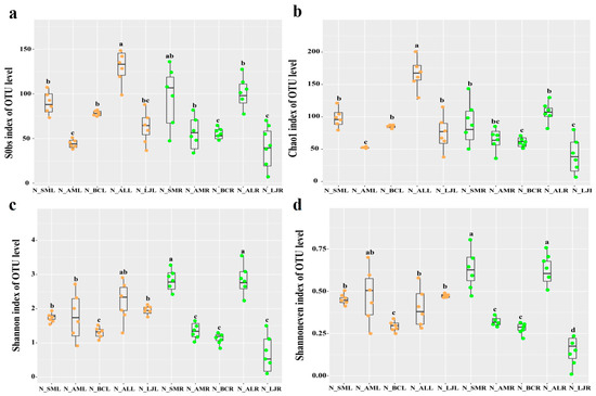 Operational taxonomic unit (OTU) richness and alpha diversity estimates of the fungal communities in November. (a) Sobs index at the OTU level. (b) Chao index at the OTU level. (c) Shannon index at the OTU level. (d) Shannon even index at the OTU level. Note: Different letters above the error bars indicate significant differences at p < 0.05. The orange dots represent the OTU of the leaf and the green dots represent the OTU of the root. Abbreviations—SM: Salvia miltiorrhiza; BC: Bupleurum chinense; AM: Astragalus membranaceus; AL: Atractylodes lancea; LJ: Lonicera japonica. R: Root; L: Leaf; N: November.