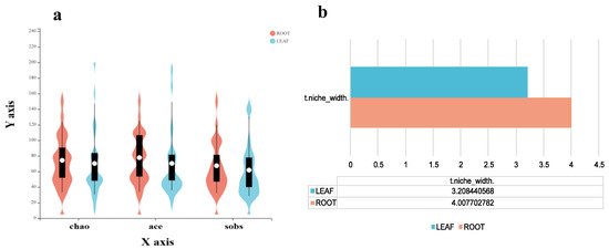 If hosts and seasons were not considered, the violin chart of the alpha diversity of endophytic fungi in the roots and leaves showed that the Chao1 index, Ace index, and Sobs index of endophytic fungi were higher in the root than in the leaf (Figure 5a). Moreover, the endophytic fungi in the root possessed higher niche widths (Figure 5b).