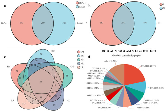 Venn diagram displaying the fungal composition among the different plant species, tissue niches, and seasons. (a), Tissue niches. (b), Seasons. (c), Plant species. (d), BC & AL & SM & AM & LJ on OTU level.Abbreviations—SM: Salvia miltiorrhiza; BC: Bupleurum chinense; AM: Astragalus membranaceus; AL: Atractylodes lancea; LJ: Lonicera japonica. J: June; and N: November.