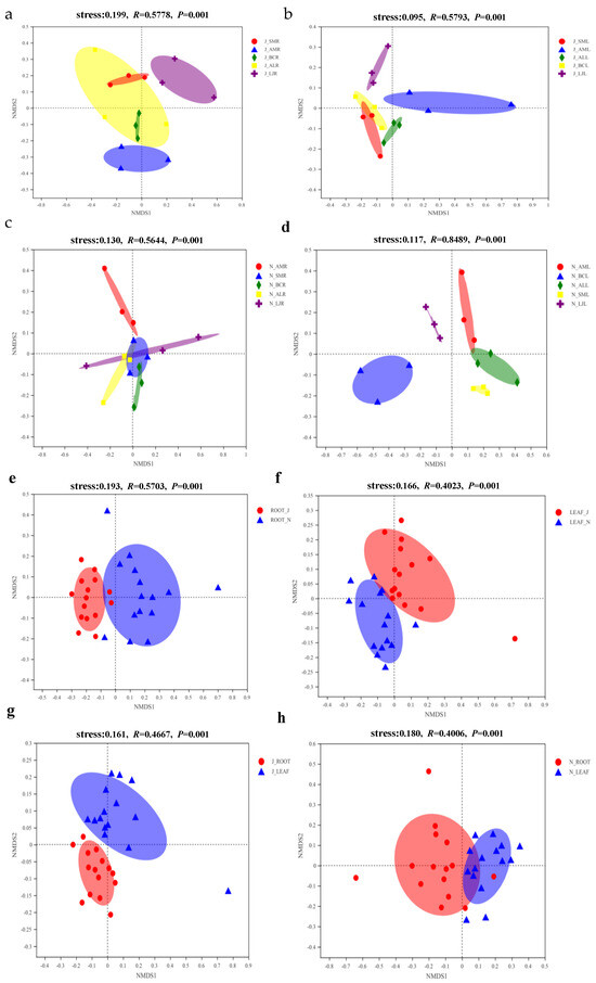 Nonmetric multidimensional scaling (NMDS) ordination of the fungal community composition among different plant species, tissues, and seasons. (a) Root in June. (b) Leaf in June. (c) Root in November. (d) Leaf in November. (e) Root in June and November. (f) Leaf in June and November. (g) Leaf and root in June. (h) Leaf and root in November. Note: ellipses in the plots denote 95% confidence intervals for the centroids of endophytic fungi among the different plant species, tissues, and seasons. Abbreviations—SM: Salvia miltiorrhiza; BC: Bupleurum chinense; AM: Astragalus membranaceus; AL: Atractylodes lancea; LJ: Lonicera japonica. R: Root; L: Leaf; J: June; and N: November.