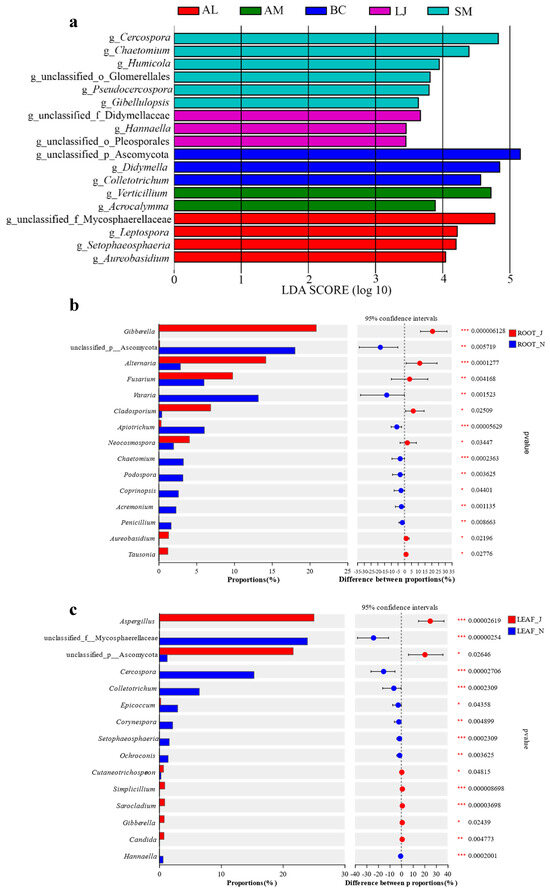 Differential abundance analysis of abundant fungi. (a) Indicator fungus with LDA scores of 2 or greater in medicinal plants. The LDA effect size (LEfSe) algorithm was used on the species level to determine the taxa that were differentially represented between the different host species. (b) Root in June and November. (c) Leaf in June and November. Note: asterisks indicate the significance levels, * p < 0.05, ** p < 0.01, and *** p < 0.001. Abbreviations—SM: Salvia miltiorrhiza; BC: Bupleurum chinense; AM: Astragalus membranaceus; AL: Atractylodes lancea; LJ: Lonicera japonica. J: June; and N: November.
