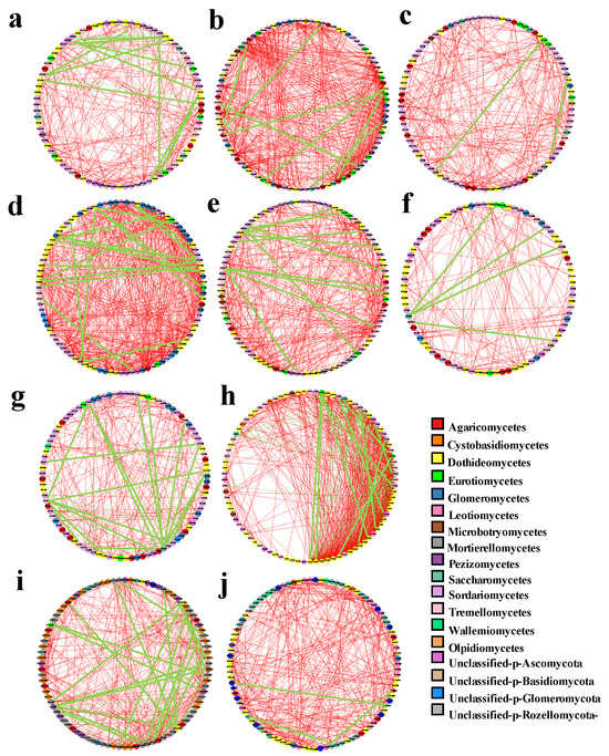 Co-occurrence networks of microbial taxa in the fungal communities. (a) BC; (b) SM; (c) AM; (d) AL; (e) LJ; (f) total endophytic fungi of plants; (g) root; (h) leaf; (i) June; (j) November. Note: The colors of the circles indicate different classes; the sizes of the circles indicate the relative abundance of the fungus. Edges represent significant interactive correlations between the pairs of OTUs. Red edges indicate positive relationships, and green edges indicate negative relationships. Abbreviations—SM: Salvia miltiorrhiza; BC: Bupleurum chinense; AM: Astragalus membranaceus; AL: Atractylodes lancea; LJ: Lonicera japonica.