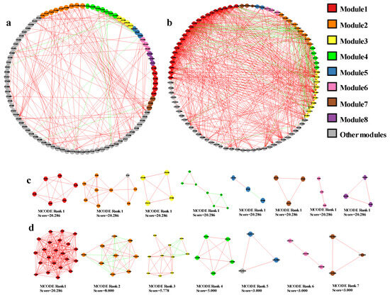MCODE analysis showing the modular groups of highly interconnected nodes in networks. (a) Co-occurrence networks of root; (b) co-occurrence networks of leaf; (c) root MCODE module; (d) leaf MCODE module. Note: the colors of the circles represent the different modules, the sizes of the circles represent the relative abundance of the fungi, the red edges indicate positive relationships, and the green edges indicate negative relationships.