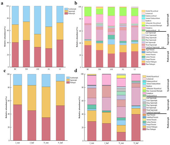 Functional prediction of endophytic fungal communities in different plant species and different tissue parts based on the FUNGuild database. (a,b) Plants species; (c,d) root and leaf. Note: The * symbol indicates the significant difference p < 0.05. The ** symbol indicates the significance level intervenes between p < 0.01. Abbreviations—BC: Bupleurum chinense; SM: Salvia miltiorrhiza; AM: Astragalus membranaceus; AL: Atractylodes lancea; LJ: Lonicera japonica. J: June; and N: November.