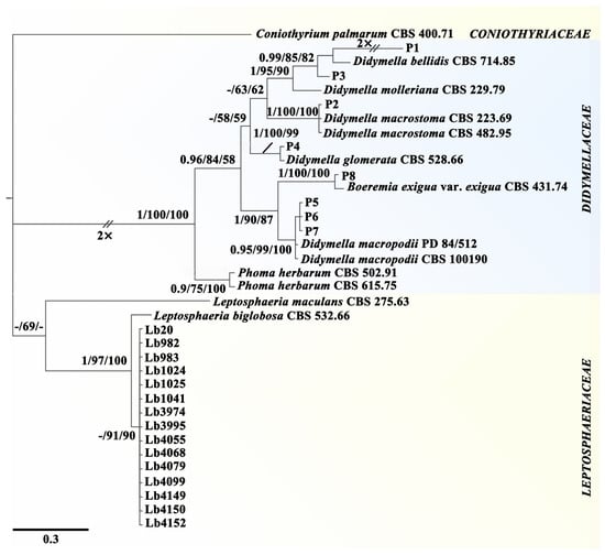 The present study clarified the taxonomic status of the eight LbR strains (P1 to P8). They belong to the same family, namely, Didymellaceae. Seven LbR strains belong to five species of Didymella, including two unidentified species of Didymella (P1, P3), D. macrostoma (P2), D. glomerata (P4), and D. macropodii (P5, P6, P7). The remaining one, namely strain P8, belongs to Boeremia exigua. All of these didymellaceous species had the telemorphs of Phoma [33]. Molecular phylogeny suggests that the LbR strains are distantly related to L. biglobosa (anamorph: Plenodomus biglobosus), which belongs to the family Leptosphaeriaceae. Strains P1 and P3 are closely related to D. bellidis; they formed two unique branches, suggesting that they might belong to two novel species. A definition of these two taxa as novel species of Didymella will be finalized in the future when more strains are collected.