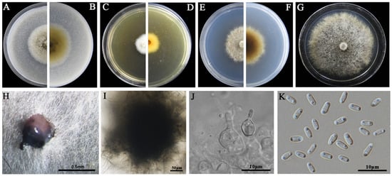Morphology of L. biglobosa Lb20. (A,B) Colony on OA (front and reverse); (C,D) colony on MEA (front and reverse); (E,F) colony on PDA (front and reverse). The cultures in (A–F) were incubated at 20 °C for 7 days; (G) colony on PDA (20 °C, 14 d); (H) pycnidia formed on PDA (note the pink pycnidiospore ooze on the surface of the pycnidium); (I) a pycnidium formed on PDA; (J) conidiogenous cells; (K) pycnidiospores (conidia).