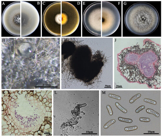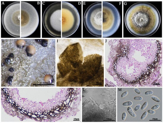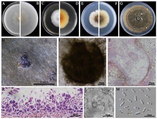 Morphology of Didymella sp. P1. (A,B) Colony on OA (front and reverse); (C,D) colony on MEA (front and reverse); (E,F) colony on PDA (front and reverse). The cultures in (A–F) were incubated at 20 °C for 7 days; (G) colony on PDA (20 °C, 14 d); (H) pycnidia formed on PDA (note the light yellow pycnidiospore ooze on the surface of the pycnidium); (I) a pycnidium formed on PDA; (J,K) sections of pycnidia; (L) conidiogenous cells; (M) pycnidiospores (conidia).