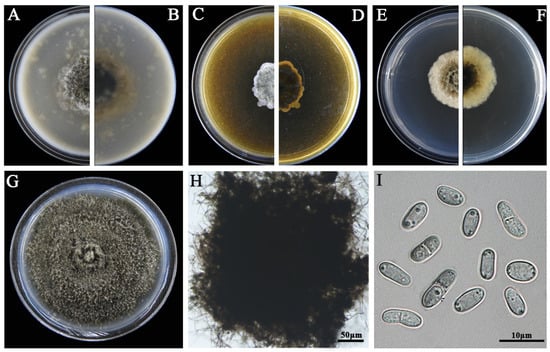 Morphology of B. exigua P8. (A,B) Colony on OA (front and reverse); (C,D) colony on MEA (front and reverse); (E,F) colony on PDA (front and reverse). The cultures in (A–F) were incubated at 20 °C for 7 days; (G) colony on PDA (20 °C, 14 d); (H) a crushed pycnidium; (I) pycnidiospores (conidia).