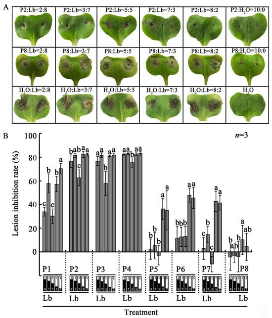 The eight LbR strains showed different effects on infection by L. biglobosa Lb20 (Figure 9). Four LbR strains (P1, P2, P3, P4) showed a highly suppressive effect on infection by Lb20; the average lesion diameters in the treatments of P1 + Lb20, P2 Lb20, P3 + Lb20, and P4 + Lb20 at six spore ratios (LbR:Lb20, 2:8, 3:7, 5:5, 7:3, 8:2) were reduced by 30–70%, 63–82%, 58–82%, and 75–83%, respectively, compared to the average lesion diameters caused by Lb20 alone at the corresponding spore concentrations. Three LbR strains (P5, P6, P7) showed a moderately suppressive effect on infection by Lb20; the effect depended on the proportion of their pycnidiospores with Lb20 in the mixed inoculum. In the low-proportion treatments (LbR:Lb20 = 2:8, 3:7, 5:5), the suppressive effect was lower than 15%, whereas in the high-proportion treatments (LbR:Lb20 = 7:3, 8:2), the suppressive effect was increased to 35–48%. The LbR strain P8 had no detectable suppressive effect (<10%) on infection by L. biglobosa.