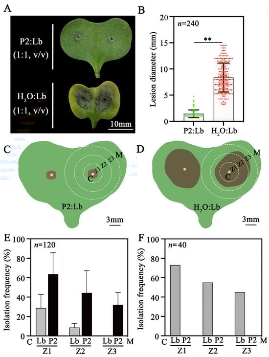 In the additional experiment, the co-inoculation of D. macrostoma P2 and L. biglobosa Lb20 (1:1) on rapeseed cotyledons also caused a slight infection with the formation of an average lesion diameter of 1.4 mm; the value was significantly (p < 0.01) smaller than that of 8.4 mm caused by L. biglobosa Lb20 alone (Figure 10A,B). Internal colonization of cotyledon tissues by P2 and Lb20 was detected in different zones (Z1, Z2, Z3) around the inoculation point (Figure 10C,D and Figure S3). In the treatment of P2 + Lb20, P2 was isolated in Z1, Z2, and Z3 with isolation frequencies of 64%, 44%, and 32%, respectively; Lb20 was isolated in Z1 and Z2 with lower isolation frequencies (29% and 9%, respectively) than those of P2, but was not isolated in Z3 (Figure 10E). In the treatment of Lb20 alone, Lb20 was isolated at frequencies of 73%, 55%, and 45% in Z1, Z2, and Z3, respectively, whereas P2 was not isolated at all in this treatment due to the absence of P2 in the inoculum (Figure 10F). The above results indicated that P2 can colonize and occupy a certain niche in rapeseed cotyledon, which may be a possible mechanism for limiting L. biglobosa infection.