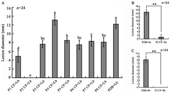 Effects of cultural filtrates of strains P1 to P8 on infection of rapeseed leaves by three rapeseed pathogens. (A) Histogram showing leaf lesion diameters caused by L. biglobosa (Lb) in different treatments (7 dpi, 20 °C). CFs, cultural filtrates; PDB, potato dextrose broth. Means ± S.D. labeled with the same letters are not significantly different (p > 0.05) according to least significant difference test; (B,C) histograms showing leaf lesion diameters caused by S. sclerotiorum (Ss) and B. cinerea (Bc), respectively (20 °C, 3 dpi). ** significantly different at p < 0.01 according to Student’s t test.