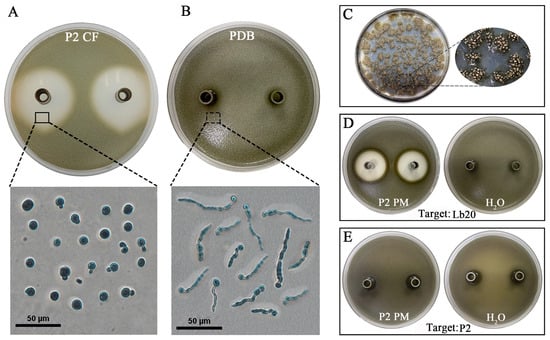 Specific antifungal activity of D. macrostoma P2 to L. biglobosa in the agar diffusion assay (20 °C, 4 d). (A) Two clear zones around two Oxford cups containing P2 CFs; note inhibition of L. biglobosa spore germination and germ tube elongation. (B) No clear zone formation around two Oxford cups containing fresh PDB; note normal pycnidiospore germination of L. biglobosa and germ tube elongation. (C) PDA culture of P2 with sticky pycnidiospore mucilages exuded from pycnidia; the mucilages were washed off with water for preparation of a pycnidiospore suspension, and pycnidiospore-associated substances (e.g., P2 PSs) were dissolved in the pycnidiospore suspension. (D) Two clear zones caused by P2 PSs and no clear zones caused by water on PDA containing pycnidiospores of L. biglobosa; (E) no clear zones caused by P2 PSs and water on PDA containing pycnidiospores of D. macrostoma P2.