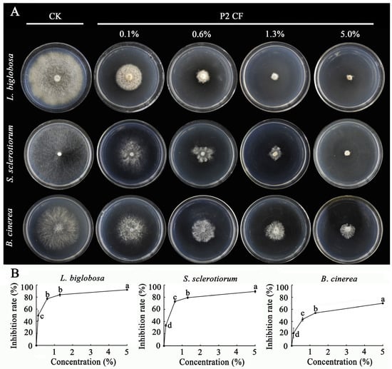 In the agar amendment bioassay, the P2 CF added in PDA at 0.1% to 5.0% (v/v) significantly (p < 0.05) reduced the colony size of L. biglobosa, S. sclerotiorum, and B. cinerea, compared to the colony size of these fungi on PDA without P2 CF alone (Figure 13A). With the increase in the concentration of P2 CFs from 0.1% to 5.0%, the inhibition rates (e.g., the percentage of colony size reduction) were consistently increased from 49% to 92% for L. biglobosa, from 33% to 89% for S. sclerotiorum, and from 20% to 70% for B. cinerea (Figure 13B).
