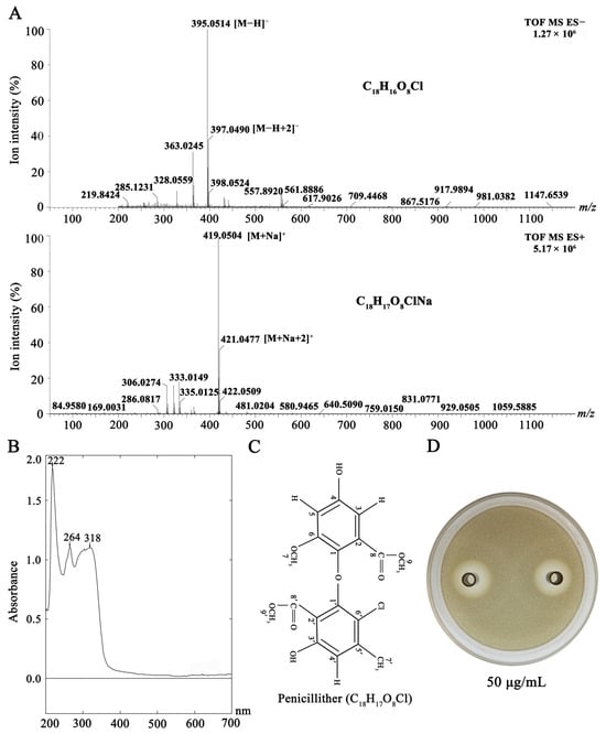 The purified fraction Fr.4.4 was a light-yellow amorphous powder (Figure S1), and it was soluble in methanol and DMSO. LC-MS detection showed that the peak intensity ratio at m/z 395 [M-H]− and 397 [M-H+2]− was approximately 3:1, and this ratio was also observed at m/z 419 [M+Na]+ and 421 [M+Na+2]+. These results indicate that there is a chlorine atom in Fr.4.4 (Figure 14A) [34]. The molecular formula of Fr.4.4 was thus deduced to be C18H17O8Cl based on the positive HR ESI-MS spectrum (m/z: observed 419.0503 [M+Na]+, calculated 419.0510) and the negative HR ESI-MS spectrum (m/z: observed 395.0517 [M-H]−, calculated 395.0534). CAS SciFinder® (https://origin-scifinder.cas.org (accessed on 28 November 2023)) indicates that Fr.4.4 might belong to penicillither or methyl 3-chloroasterric acid. UV absorption determination indicated that Fr.4.4 formed three characteristic absorption peaks at 222, 264, and 318 nm (Figure 14B), suggesting that this compound is penicillither, and this was confirmed by the partial data of the 1H-NMR (DSMO, 600 MHz) and 13C NMR (DSMO, 125 MHz) spectra (Table 4; Figures S5 and S6). Quantitative analysis indicated that the content of penicillither was 45.5% in P2 CE, and the concentration of penicillither was 127.3 ± 18.6 μg/mL in P2 CF and 117.8 ± 21.5 μg/mL in P2 PS (1 × 108 spores/mL). The agar diffusion bioassay showed that penicillither had antifungal activity towards L. biglobosa (Figure 14C), and it produced inhibition diameters of 1.8 and 2.3 cm at concentrations of 50 and 100 μg/mL, respectively.