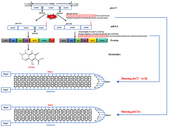 To interfere with the expression of specific genes, the method of constructing hairpin RNA was used in this study [26]. As shown in Figure 1, the intron 2 fragment of the pksCTα gene consists of 62 bp, the first 21 bp at the 5′ end were selected as a trigger for forming ihpRNA structure to silence the pksCTα gene. In addition, the 21 bp region (from 445 bp to 466 bp) of exon 3 was chosen as the trigger for forming ihpRNA structure to silence the pksCT (α + β) gene. The primers used in plasmid construction are listed in Table 1. Then these recombinant plasmids were confirmed using PCR and double digestion (Figure S1c–e) (for detailed construction and confirmation, see Supplementary Methods).