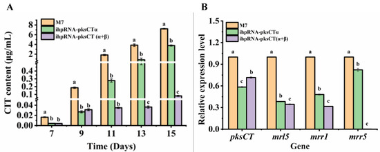 Citrinin (CIT) yield of three different Monascus strains during a 15-day fermentation (A) and RT-qPCR verification of the gene expression level in CIT biosynthesis (B). Different letters indicate statistical differences (p < 0.05) between strains. M7: the wild-type strain; ihpRNA-pksCTα: the transformant strain with silenced pksCTα gene; ihpRNA-pksCT (α + β): the transformant strain with silenced pksCT(α + β) gene.
