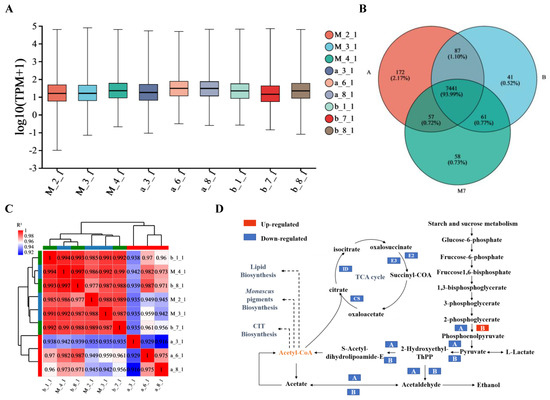 Comparative gene expression between M7 (the control group, wild-type strain), A (Monascus transformant with silenced pksCTα gene, the experimental group), and B (Monascus transformant with silenced pksCT (α + β) gene, the experimental group). (A) depicts the distribution of gene expression. TPM: the transcripts per million reads. (B) shows the pairwise comparison of the number of gene expressions. The green ball represents M7, red ball represents group A, and blue ball represents group B. (C) reflects the correlation between different samples. The change in color from blue to red indicates a higher correlation. (D) represents the change in expression levels of the differentially expressed genes in the glycolysis pathway. TCA cycle: citrate cycle.