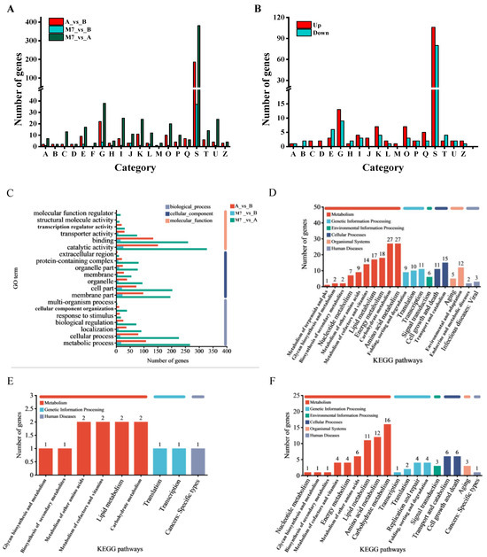 DEGs from the three comparison groups were categorized into three major categories, molecular function (MF), biological process (BP), and cellular composition (CC), following annotation via the GO database (Figure 4C). In the MF category, over 130 genes from the first group (M7_vs._A) and the third group (A_vs._B) were assigned to the GO term “catalytic activity and binding”. The second group (M7_vs._B) contained 26 and 16 genes associated with the GO terms “catalytic activity and binding”, respectively. Regarding BP terms, 108, 18, and 267 genes from the first, second, and third comparison groups, respectively, were assigned to the GO term “metabolic processes”, with slightly more genes involved in metabolic processes than cellular processes. In the CC group, the top three enriched GO terms were “membrane part”, “cell part”, and “organelle”.