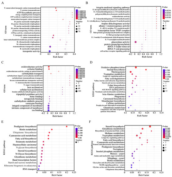 Gene Ontology (GO) database enrichment (A–C) and Kyoto Encyclopedia of Genes and Genomes (KEGG) database enrichment (D–F) analysis of the differentially expressed genes in the three comparison groups of M7_vs._A, M7_vs._B, and A_vs._B, respectively. Group M7: the wild-type strain; group A: the transformant strain with silenced pksCTα gene; group B: the transformant strain with silenced pksCT (α + β) gene. T: transporter activity; B: biosynthetic process; M: metabolic process; E: enzyme activity.